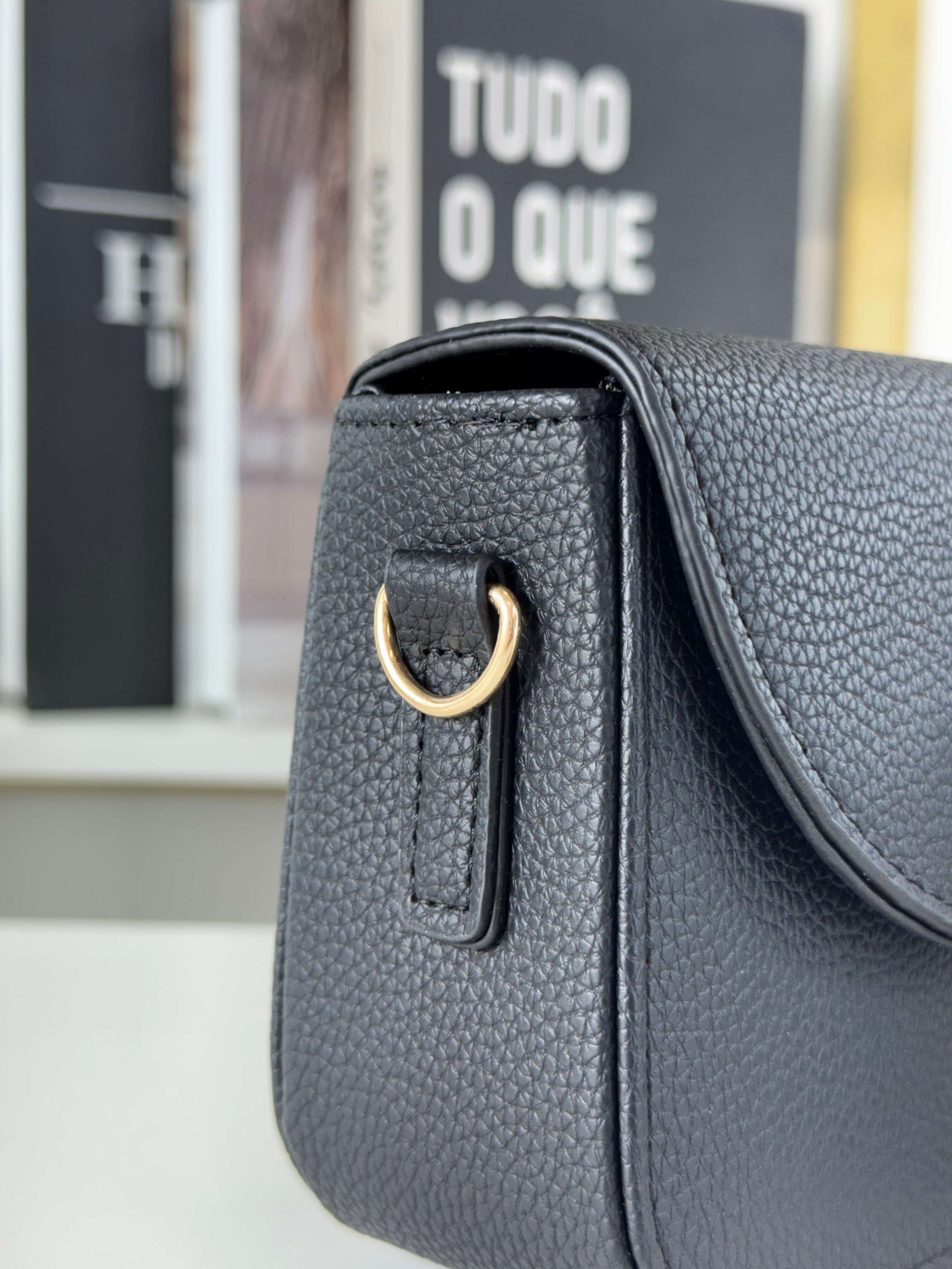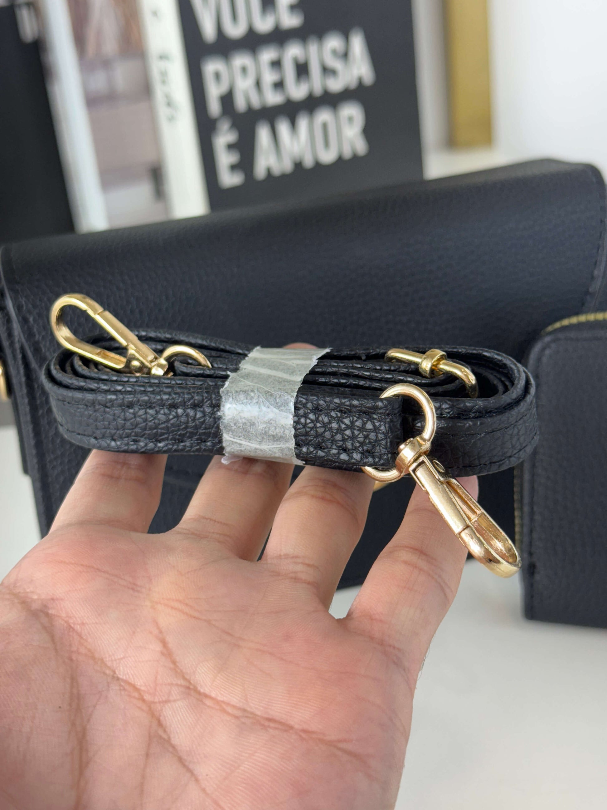 · Possuí fecho em botão magnético e alça transversal ajustável e removível no mesmo material da bolsa.